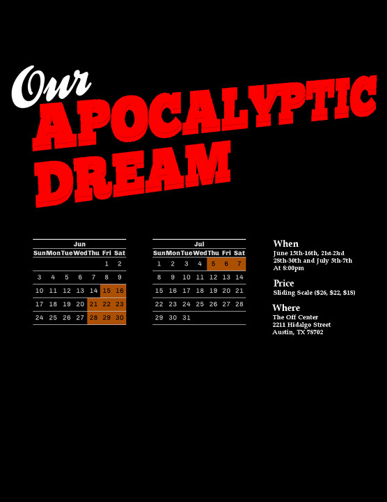 Come out and see Our Apocalyptic Dream. 7 playwrights. One story. We didn’t kill each other… yet. But in case of apocalypse all bets are off.